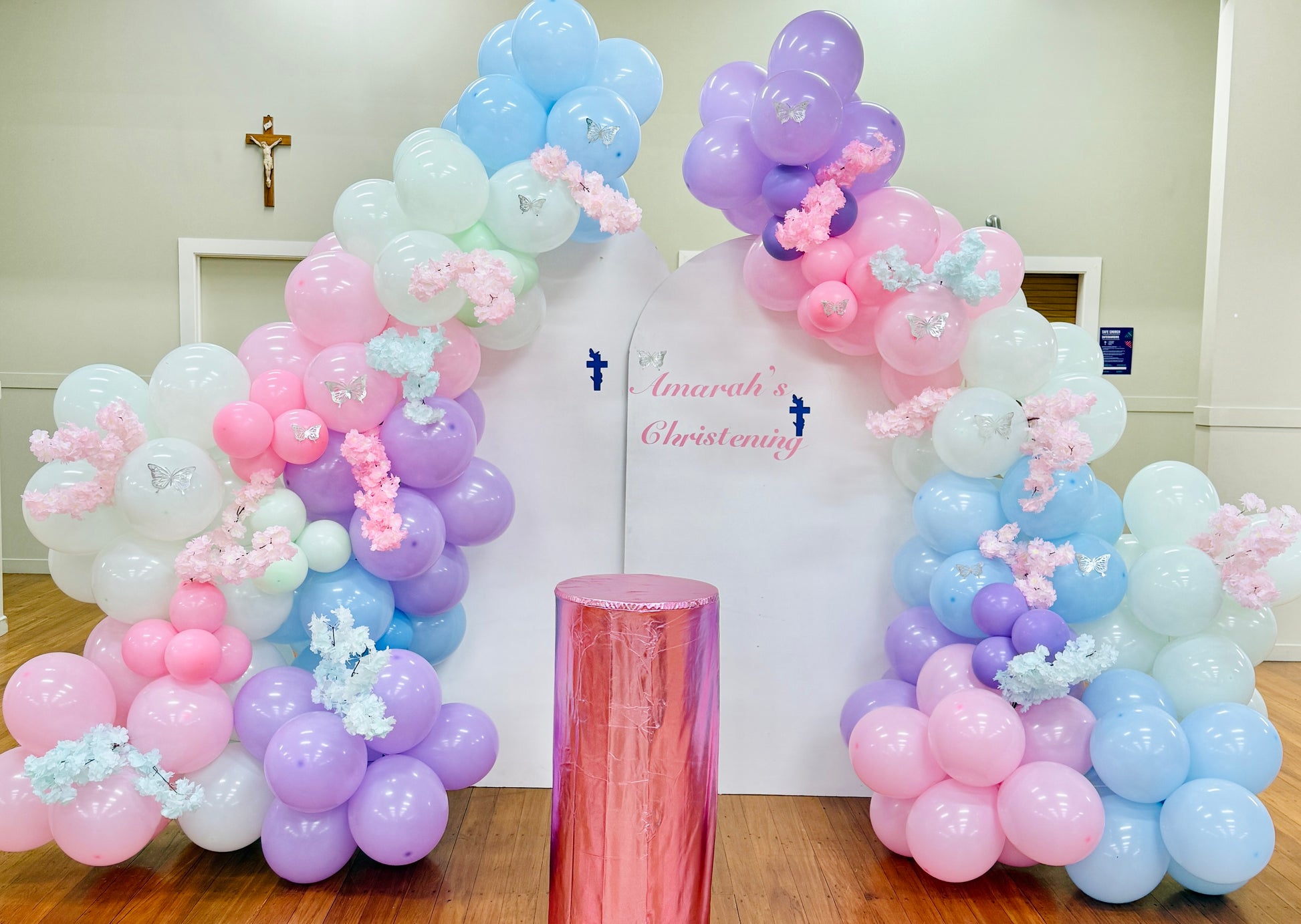 Double Arch Board Backdrop with Balloon Garlands and Cake Plinth